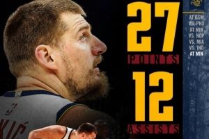 1. 赛季个人第七次三双!掘金官方晒约基奇本场数据:27分10板12助