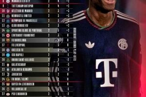 拜仁官推晒两轮过后欧冠积分榜:拜仁以进球优势领跑,皇马次席