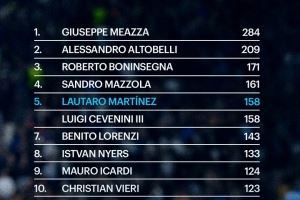 国米队史射手榜:劳塔罗158球升至第5位,伊卡尔迪124球第9